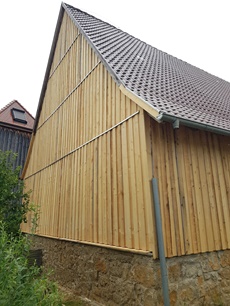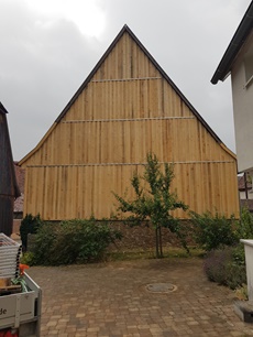 August 2025 | Kleinere Schäden an Rähm und Ortgängen habe ich fachgerecht behoben – solide Zimmererarbeit, die man auf den ersten Blick vielleicht gar nicht sieht, die aber den Unterschied macht. Um die Fassade dauerhaft zu schützen, habe ich eine robuste Boden-Deckelschalung angebracht, die dem Gebäude nicht nur Stabilität, sondern auch eine schöne, handwerkliche Optik verleiht.