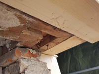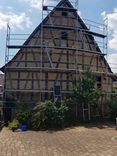 August 2025 | Die alte Fassadenverkleidung wurde vom Bauherren entfernt und das darunterliegende Fachwerk freigelegt. Nach einer gründlichen Begutachtung habe ich beschädigte Holzteile wie Schwelle und Ecksäule fachgerecht ersetzt – und dabei so viel wie möglich von der bestehenden Ausfachung erhalten, um Zeit und Kosten zu sparen. So bleibt ein Stück Geschichte bewahrt, während das Haus für die Zukunft wieder solide dasteht.
