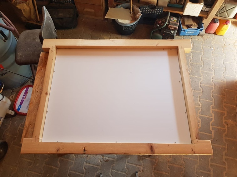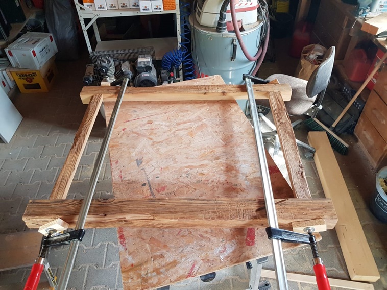 Für den Rahmen wählte ich einen alten Tannenbalken, den ich beim Abbruch einer Scheune in Carolins Heimat Weissach im Tal gesichert hatte – ein Stück alte Heimat für ihre neue Heimat. Aus dem ursprünglich vierkantigen Balken schnitt ich vier Teile, versah die Rückseite mit einem umlaufenden Falz und setzte das Schild bündig und verdeckt von hinten ein.