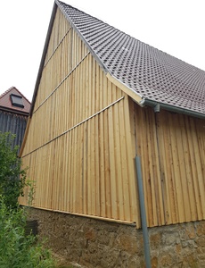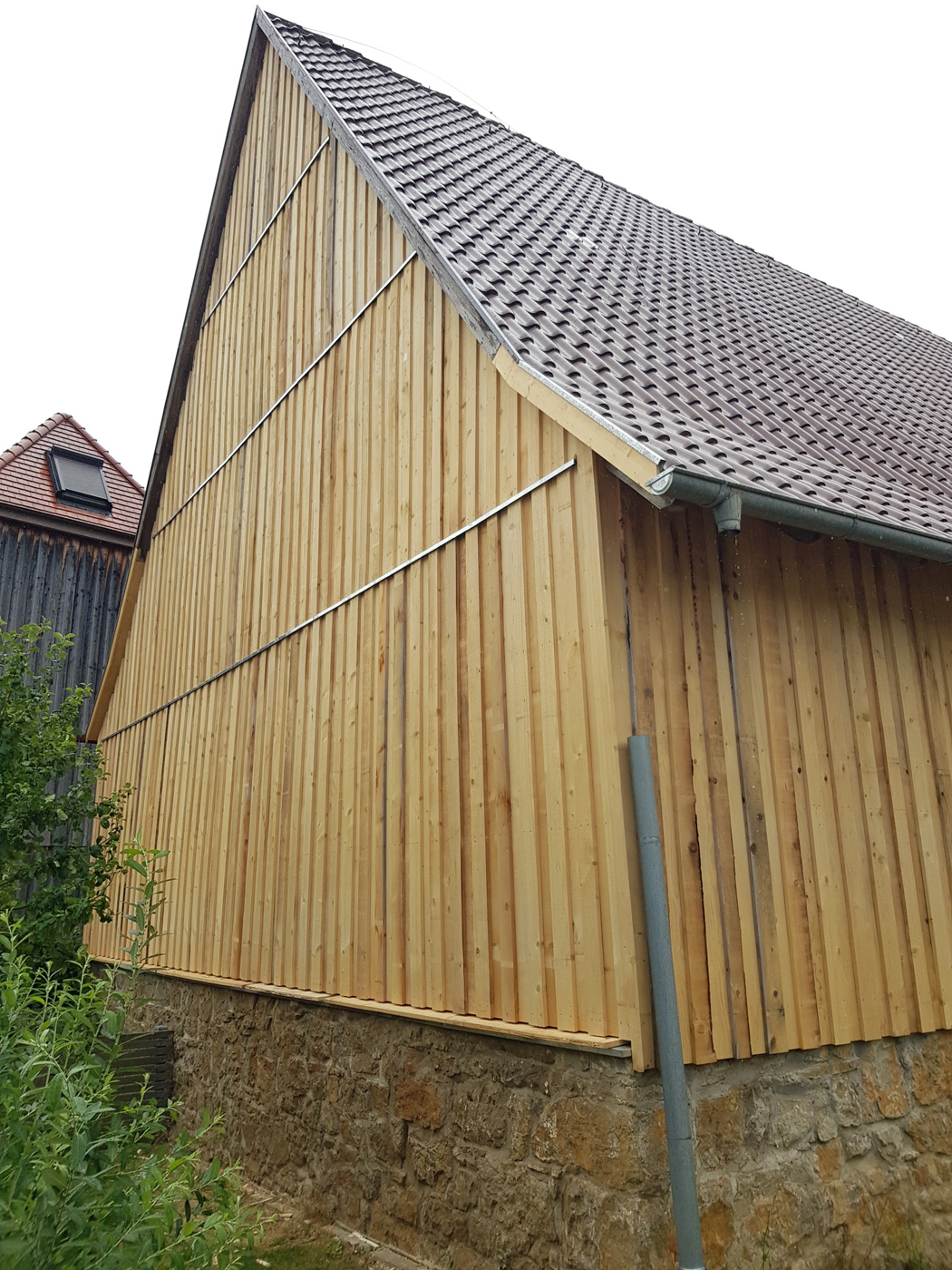 August 2025 | Kleinere Schäden an Rähm und Ortgängen habe ich fachgerecht behoben – solide Zimmererarbeit, die man auf den ersten Blick vielleicht gar nicht sieht, die aber den Unterschied macht. Um die Fassade dauerhaft zu schützen, habe ich eine robuste Boden-Deckelschalung angebracht, die dem Gebäude nicht nur Stabilität, sondern auch eine schöne, handwerkliche Optik verleiht.