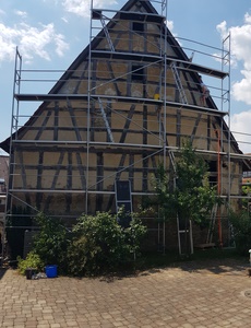 August 2025 | Die alte Fassadenverkleidung wurde vom Bauherren entfernt und das darunterliegende Fachwerk freigelegt. Nach einer gründlichen Begutachtung habe ich beschädigte Holzteile wie Schwelle und Ecksäule fachgerecht ersetzt – und dabei so viel wie möglich von der bestehenden Ausfachung erhalten, um Zeit und Kosten zu sparen. So bleibt ein Stück Geschichte bewahrt, während das Haus für die Zukunft wieder solide dasteht.